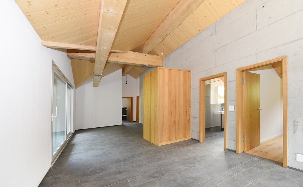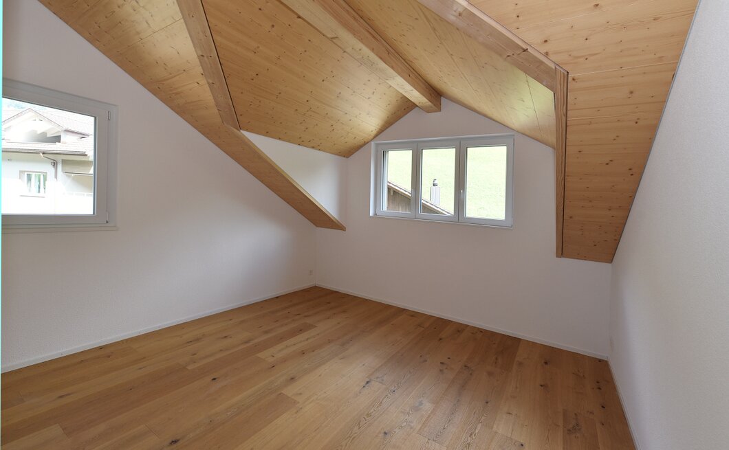 Diese Wohnung verfügt über eine grosse Anzahl weiterer Vorzüge, wie beispielweise einer grosszügigen Küche, einem offenen Wohn- Essbereich, moderne Badezimmereinrichtung, praktischer Garderobenschrank im Eingangsbereich, hohe Holzdecken mit schrägen sowie einem gedeckten Balkon.