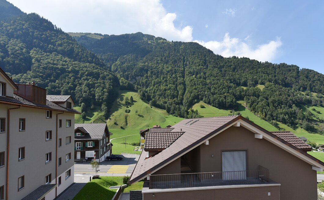 Neben der ruhigen Lage, weiss die Wohnung mit Blick auf die umliegenden Berge zu gefallen.