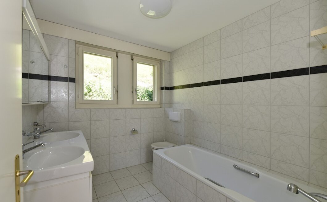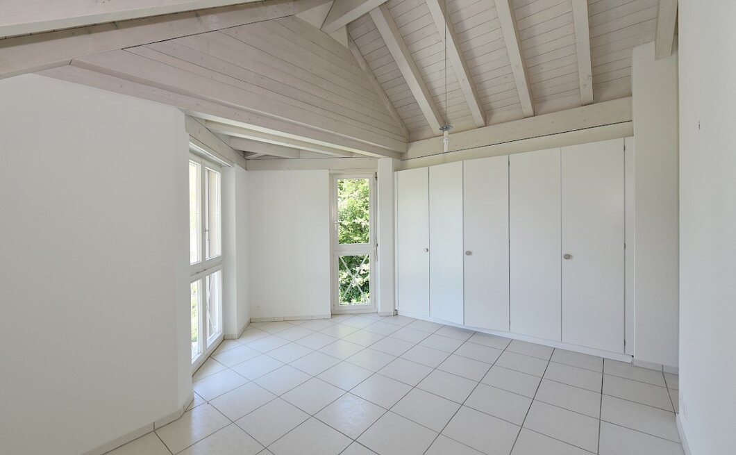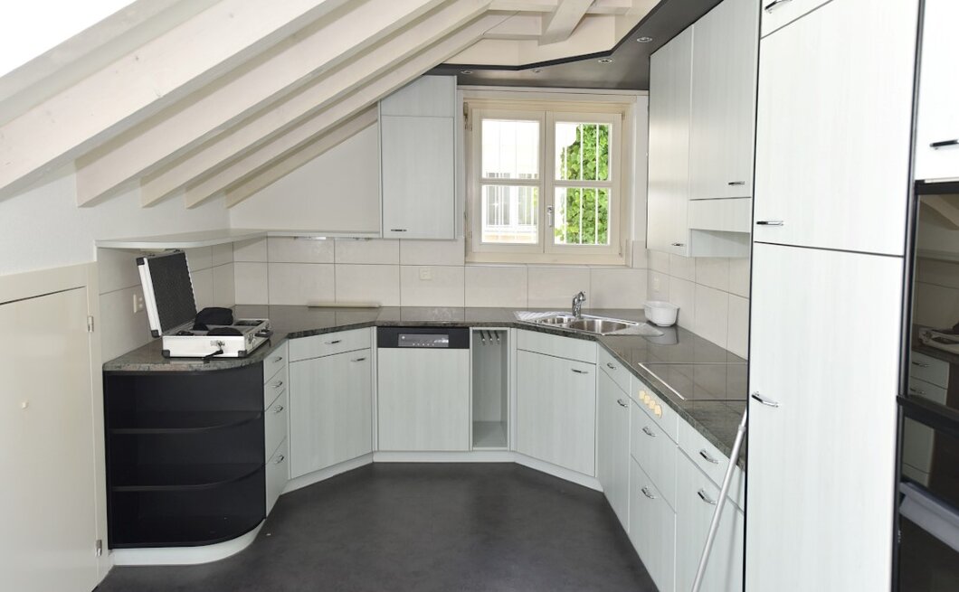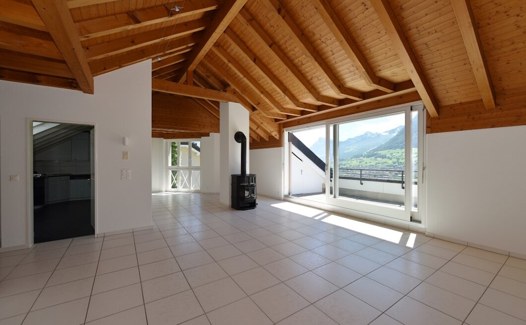 Im Wohnzimmer finden Sie viel Platz und dank grossem Panoramafenster einen atemberaubenden Ausblick in die umliegende Landschaft. Neben der prächtigen Aussicht, weiss die Wohnung vor allem durch seinen praktischen und offenen Grundriss zu gefallen. Das Raumgefühl ist durch die schrägen Holzdecken wunderbar.