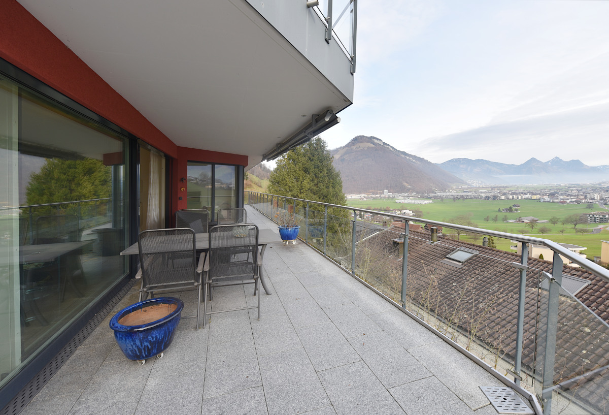 Die Wohnung befindet sich in einem Zweifamilienhauses. Es erwartet Sie eine phänomenale Aussicht auf die umliegende Berglandschaft bis auf den See.